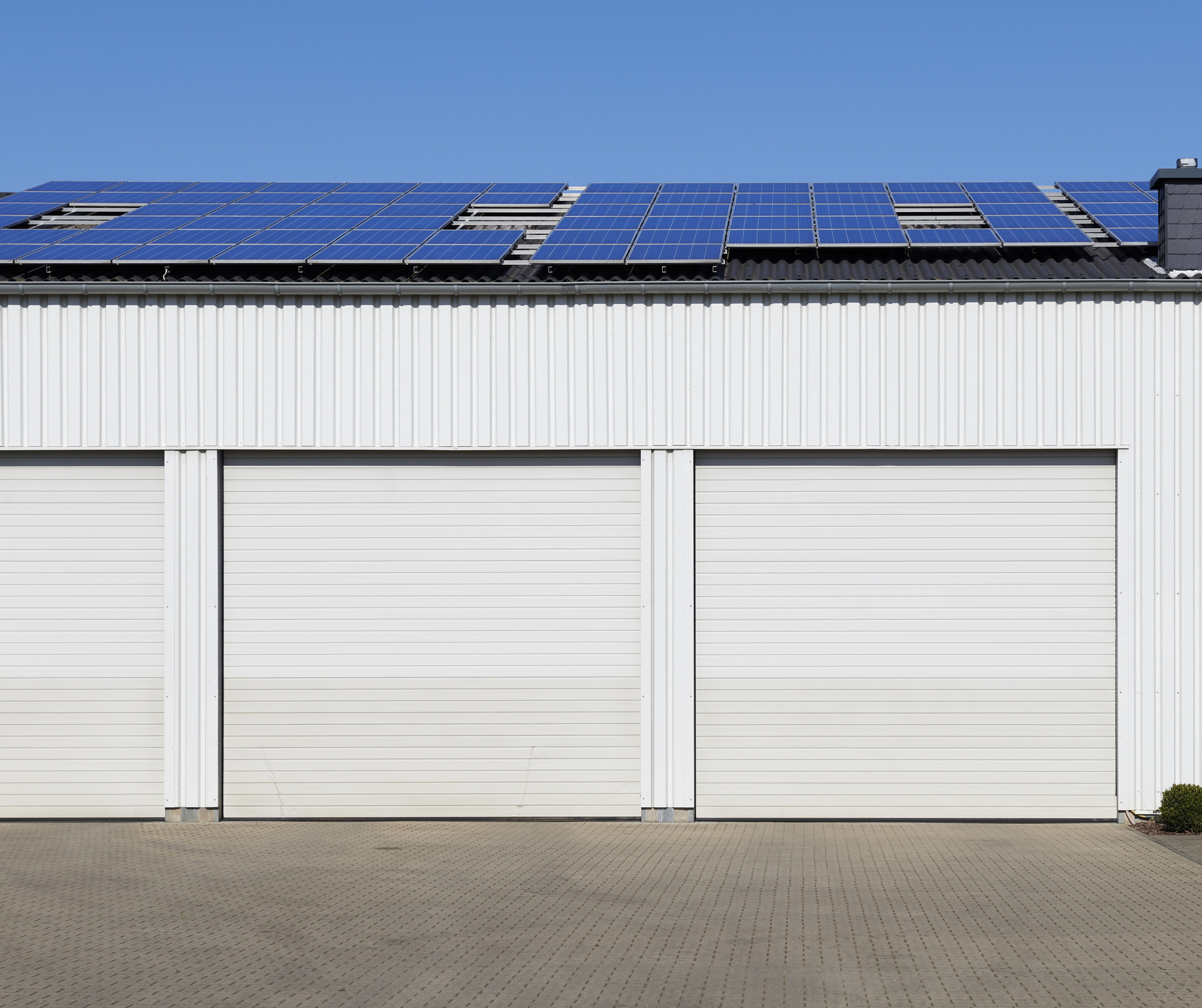 Inicio » Soluciones sostenibles en puertas automáticas: innovación al servicio de la eficiencia » White rolling garage doors and solar panels of a warehouse